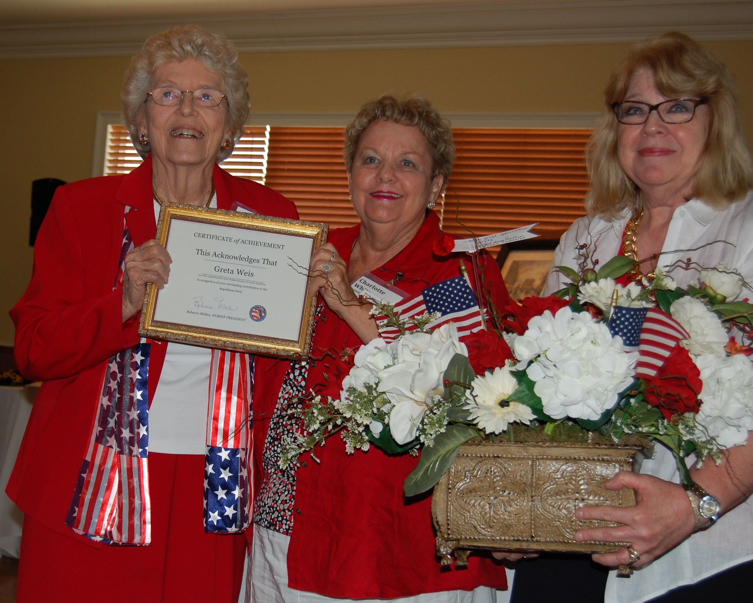 L to R: 2024 NORWF Oficer installation. Officiant President Barbara Price of the Florida Federation of Republican Women; Sandy Bove, Corresponding Secretary; Joni Keams, Assistant Treasurer; Barbara Solomon, Second Vice President; Charlotte, Treasurer; Katie Hope, President; in foreground is Verlie Norris, Recording Secretary. Marty Harris, First Vice President is absent.